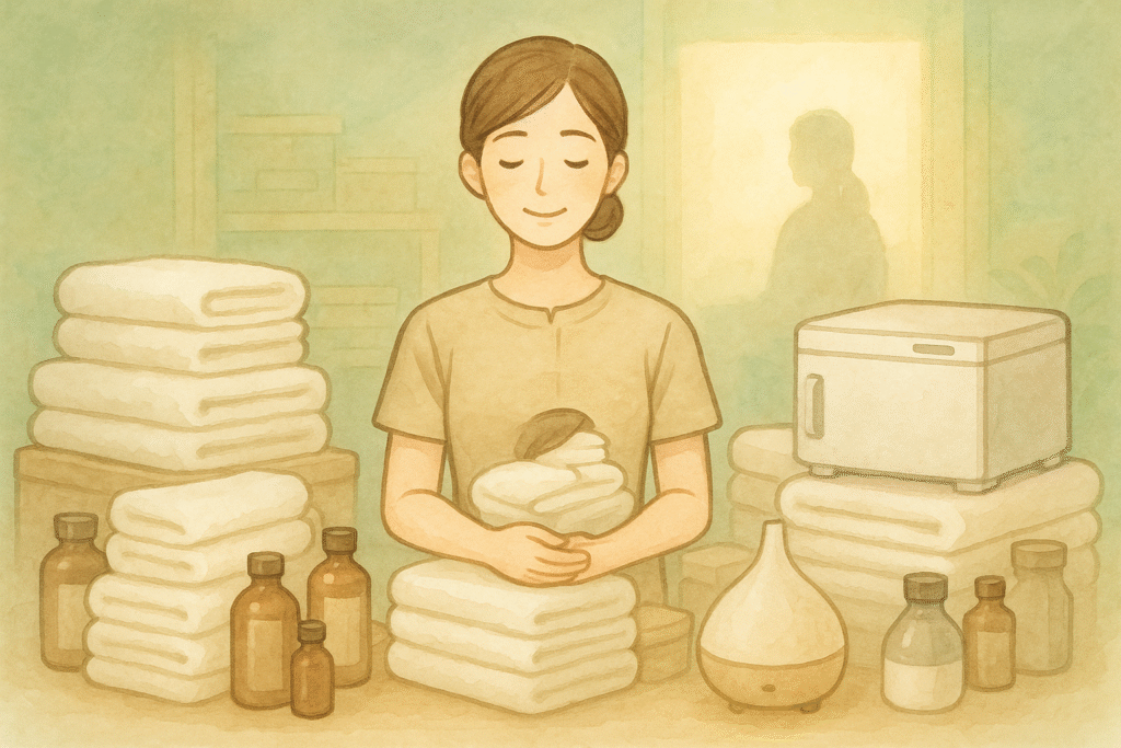 タオル、オイル、シーツ、加湿器、ディフューザー……。
